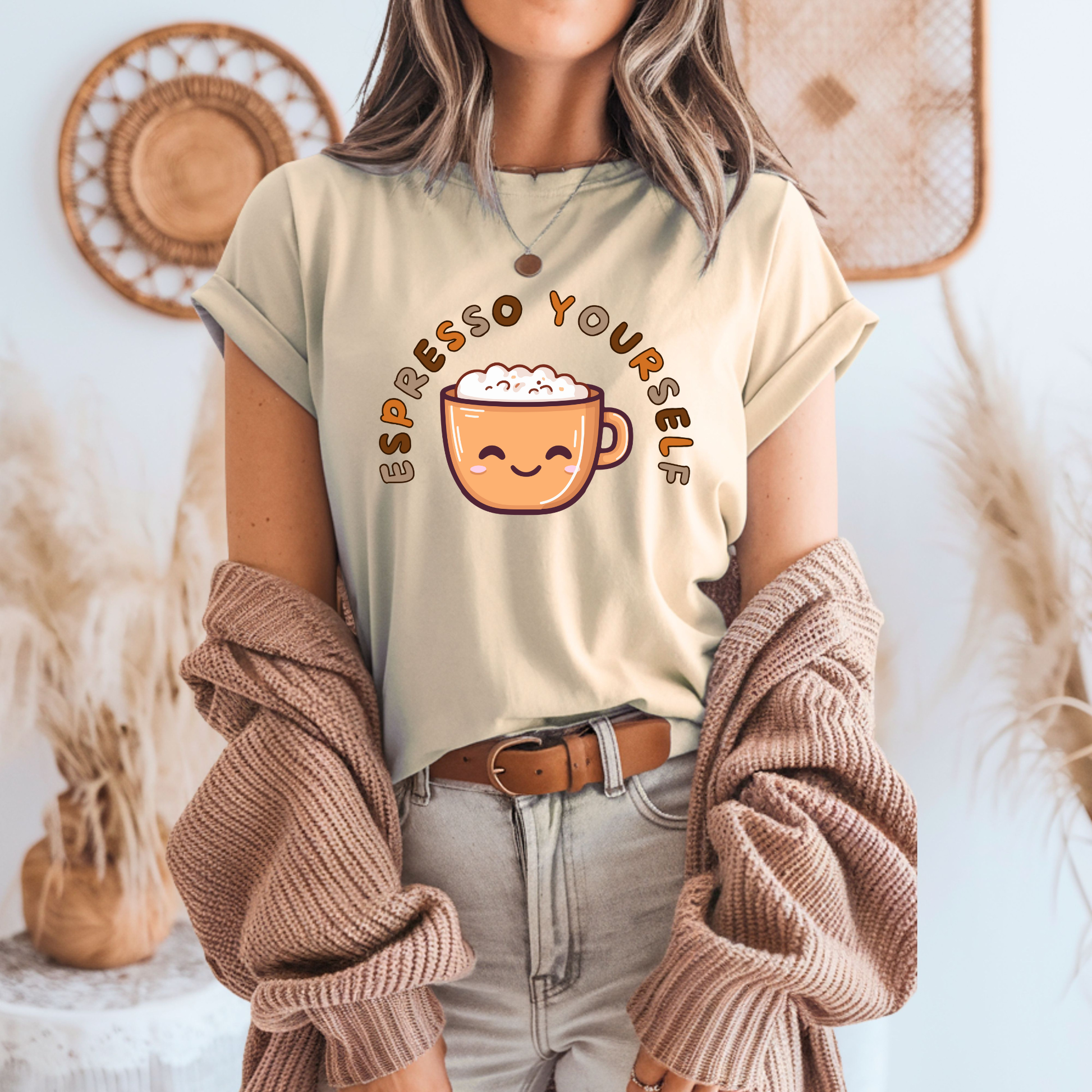 Start your day with a dose of caffeine and confidence! Our “Espresso Yourself” graphic tee is the perfect blend of cozy comfort and playful charm. With its soft fabric and cheerful coffee-inspired design, it’s made for coffee lovers who believe every day’s a fresh brew of possibilities. 🌸