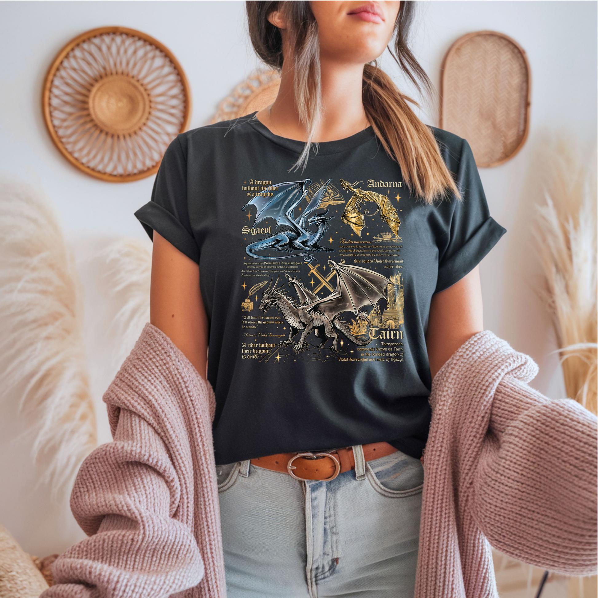 Step into your fantasy era with the Fourth Wing Dragon Tee, inspired by the fierce power and magic of dragon in the Fourth Wing Novel Series. Featuring beautifully detailed artwork of soaring dragons in gold and blue tones, this tee is a dream for very book lover and fantasy fan.