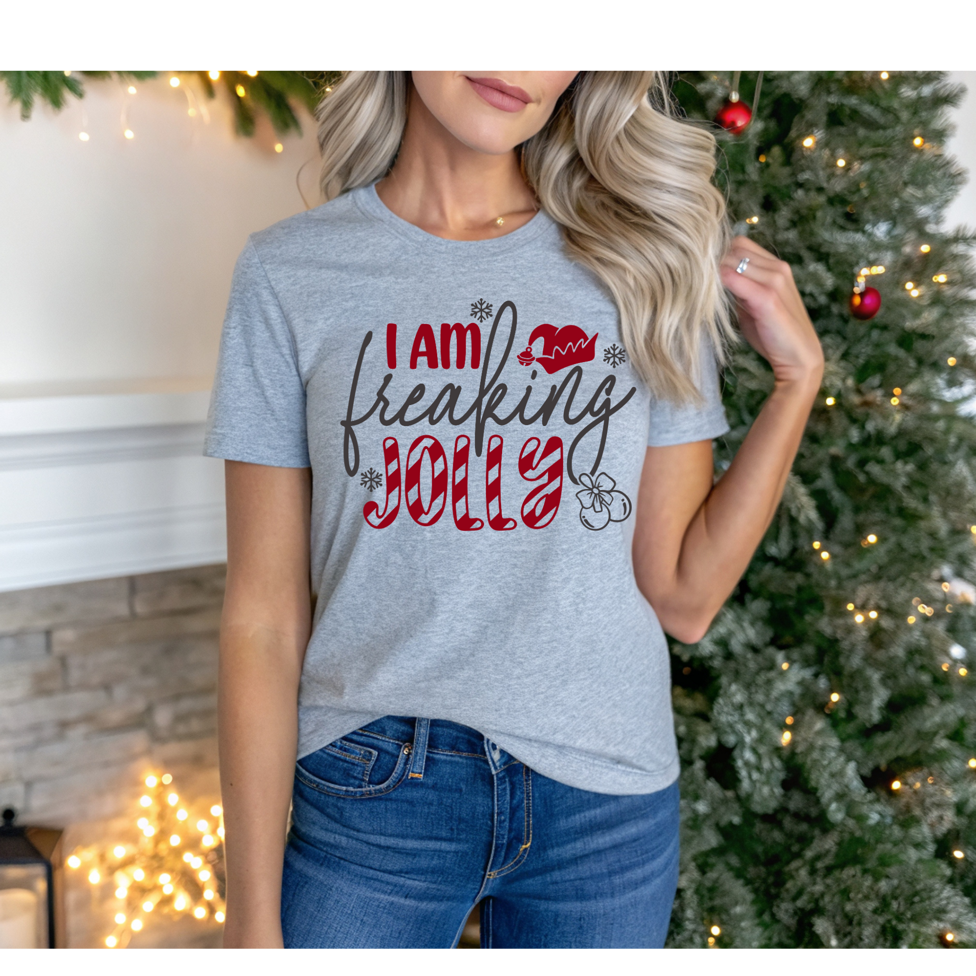 Bold, cute, and a little sassy, the “I Am Freaking Jolly” graphic brings the perfect mix of festive spirit and playful attitude. Featuring candy cane stripes, snowflakes, and a Santa hat, it’s the ideal Christmas tee.