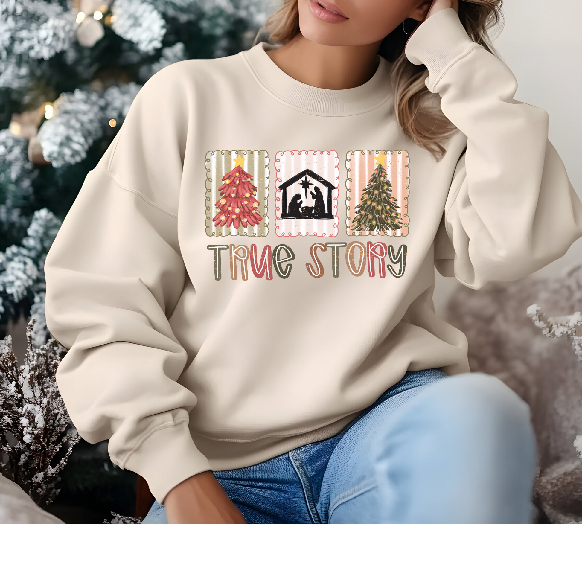 This cozy sand-colored crew features three festive panels — two Christmas trees and a nativity silhouette — paired with soft, whimsical lettering that reads True Story.